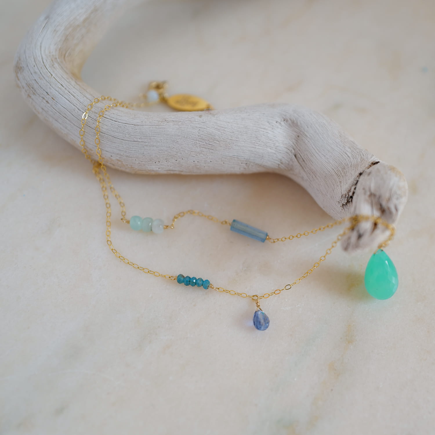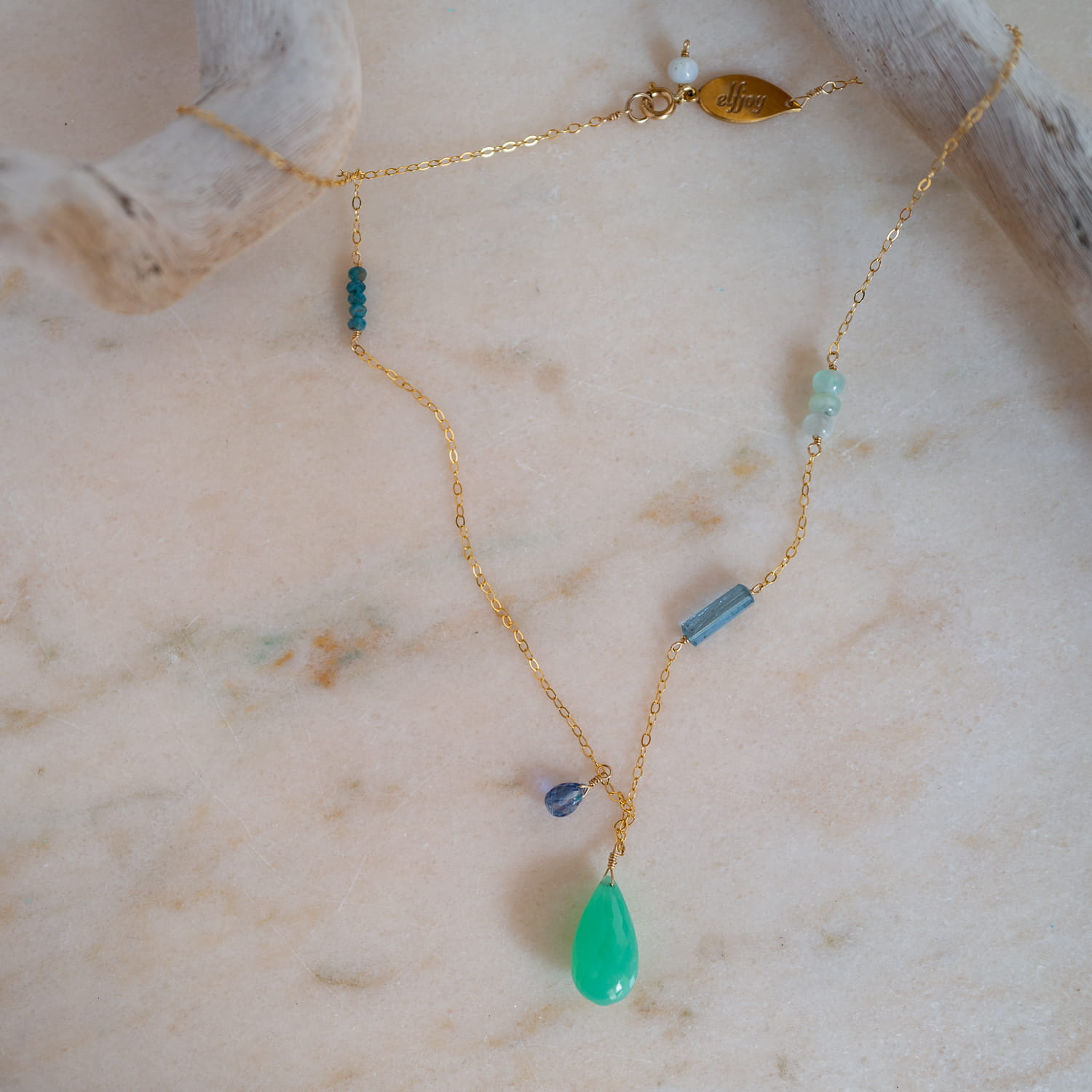 Naszyjnik z intensywnie zielonym chryzoprazem w kształcie łezki, w towarzystwie kropelki intensywnie niebieskiego cyjanitu, intrygująco fiołkowego tanzanitu oraz delikatnych opali wraz z apatytami wplecionymi w łańcuszek.